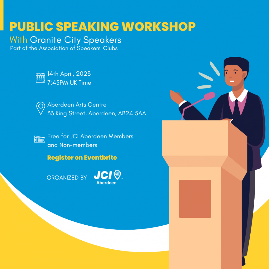 JCI Aberdeen is delighted to partner up with Granite City Speakers which is part of the Association of Speakers’ Clubs (ASC). The speakers’ club helps it members to improve their public speaking and leadership skills. This event will be held on Friday, the 14th of April, at the Aberdeen Arts Center on King Street, at 7:45PM (UK Time).